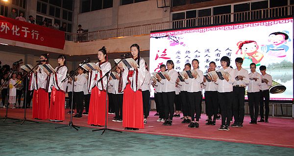 率先出场的代表队,在古筝的伴奏下,同学们齐声诵读《弟子规》,意境深远。“慈母手中线,游子身上衣。临行密密缝,意恐迟迟归。谁言寸草心,报得三春晖”。《游子吟》感人肺腑的场景告诉我们,莫要等到树欲静而心不止,子欲养而亲不待,才后悔没能尽到孝心;“爱我中华,传承经典”,响亮的口号在体育馆响起,接着出场的是旅游系的同学们,“记得吗,你祖先的名字叫炎黄?”提醒现代青年不忘祖先,树立文化自信。吟诵穿插,在“泛爱众”部分,用吟唱的形式表达,使整个现场气氛达到高潮;大军压境,两军争霸,仁孝在心头,忠义不敢丢,少年岳飞,精忠报国,诵读经典,忠孝仁义,作为压轴的信息系同学,随着口号,缓缓呈“义”字散开,与众不同的是,他们实行传统礼仪中的坐礼,这是一个大胆的决定,也是万花从中一点绿,响亮的诵读,默契的配合,使他们在过程中游刃有余,一曲终了,顶礼经典……