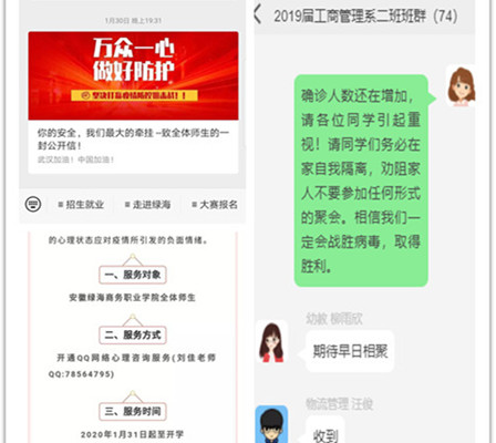 科学引导强信心。面对汹汹而来的疫情,学院自上而下,压实责任链条,组织各级干部开展“拉网式”信息排查,要求辅导员精准掌握每位学生思想状态、身体状况和活动轨迹等信息,及时汇总上报,对有外出史、出现感冒症状的学生重点关注。同时,重点关注家庭经济困难学生,及时回应师生关切,细致解答各种问题。学院专门开通了线上心理支持服务,引导师生稳定情绪、坚定信心。同时通过互联网短文、图片、小视频多种途径和形式开展宣传教育活动,增强学生战“疫”必胜的信心。hth首页登录学子被学院的真情所深深打动。