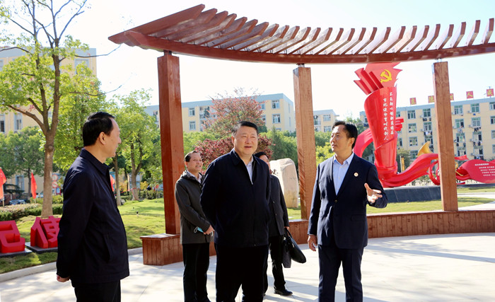 解平副厅长一行首先来到学院党建文化广场,对党建文化广场建设给予充分肯定,指出是学院创建“党建引领示范校”的实际举措,是全面推进“大思政课”建设的具体实践。为深入贯彻新时代党的建设总要求,华体会vip于今年暑假期间正式启动党建文化广场建设工作。党建文化主题广场的建设,不仅是独具特色的“红色地标”,更是重要的思想政治理论课教学实践基地,是学院深入贯彻落实习近平总书记在学校思政课教师座谈会重要讲话精神的具体举措,也是创新大学生思想政治理论课教学内容、教学方式的有益尝试,是思想政治理论课教学第二课堂的重要补充,让师生群众精神生活有方向、有动力,增强基层党组织的凝聚力和战斗力,为学院实现跨越发展汇聚正能量,提供新动能。