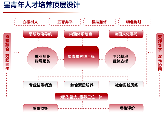 学校党委紧扣立德树人根本任务,坚持文化塑校,将星青年培养与“四史”教育相结合、与中华优秀传统文化教育相结合、与思政课改革创新相结合、与创新创业教育相结合、与职业实践教育相结合、与社会责任教育相结合。构建了以“三大文化”为主脉,以学校办学理念为重点,以星青年文化为特色,以君子文化、红色文化、工匠文化、科技文化、双创文化、社会实践文化等为内涵体系的hth首页登录文化大厦。